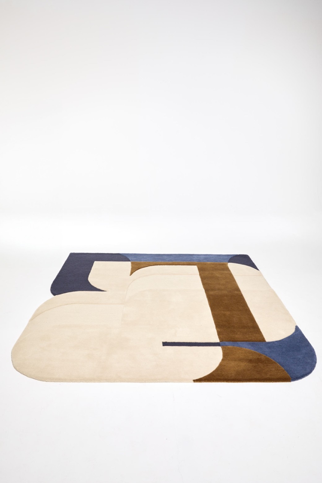 The colors contrast with the solids and voids of the design, creating a visual interplay of shapes and colors in Tobacco, Navy and Cream.